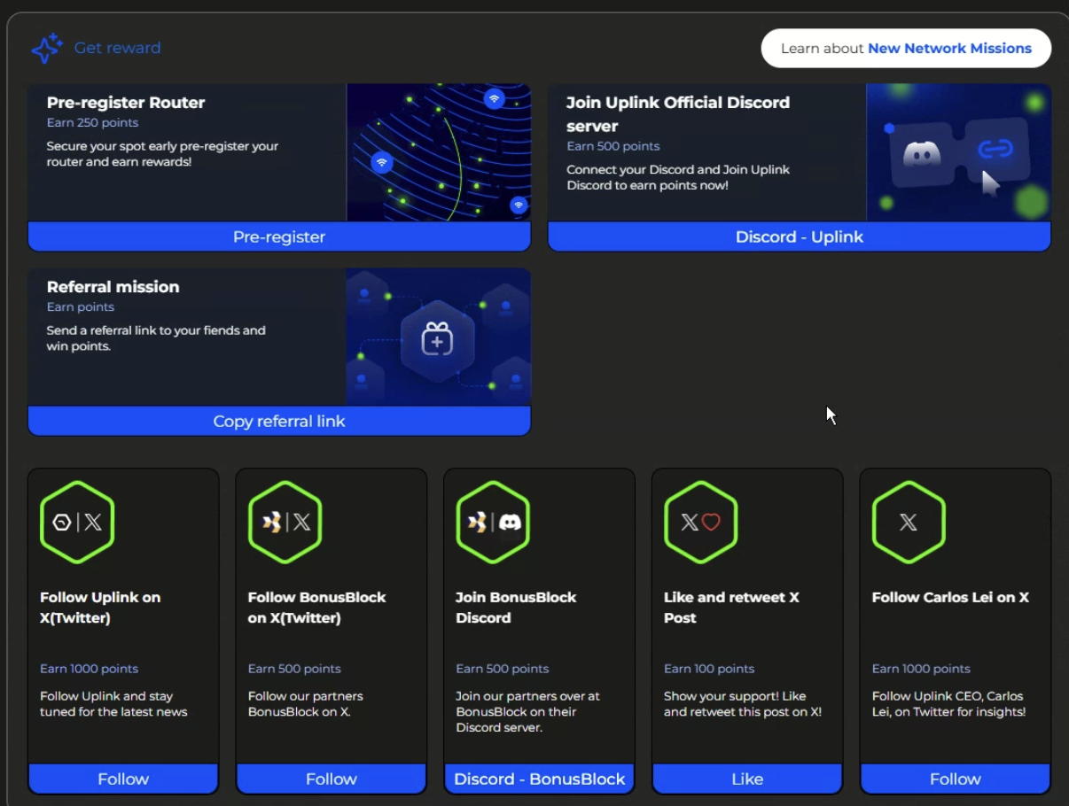 - 대시보드 하단의 디스코드 서버에 참여하고, 트위터 미션 등을 수행하여 추가 포인트를 획득할 수 있습니다.